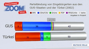 Berlin, im Mai 2010 - Obwohl die Russlanddeutschen weiterhin eine recht stabile Vorliebe für die christdemokratischen Parteien (siehe Tabellen) zeigen, neigt unter ihnen eine wachsende Minderheit der SPD zu. Bei den Türkeistämmigen hat sich dagegen seit 2002 keine größere Nähe zur CDU entwickelt, sagt Wüst aufgrund eigener Untersuchungen, in die auch Daten eingeflossen sind, die das Zweite Deutsche Fernsehen erhoben hat.