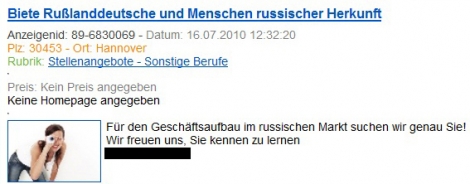 Berlin (im Juli 2010) – Die Überschrift mutet ziemlich absonderlich an: „Biete Rußlanddeutsche und Menschen russischer Herkunft“. Wie kommt es, dass da jemand Russlanddeutsche im Angebot hat? Und zu welchem Zweck sollte man sie erwerben? Die Anzeige im Internet gibt dann doch noch weitere Auskünfte und es wird klar: Russlanddeutsche werden nicht angeboten, vielmehr gesucht, und zwar „für den Geschäftsaufbau im russischen Markt“.
