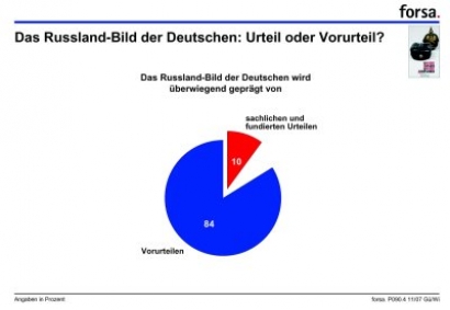 Eine Medieninhaltsanalyse des F.A.Z. Institutes Prime Resarch International, die – wie auch die forsa-Studie - im Auftrag von WINGAS* das Russlandbild in führenden deutschen Medien untersuchte, bestätigt diesen Eindruck und stellt den Journalisten kein gutes Zeugnis aus. In der Berichterstattung ließ sich eine starke Einfärbung und Emotionalisierung durch wiederkehrende Stereotypen feststellen. Mehr als ein Drittel der Berichterstatter (36 Prozent) greife auf Vorurteile zurück. Eine positive Berichterstattung zu Russland findet sich nur bei Themen Kunst, Kultur, Wissenschaft und Tourismus. Solche Berichte genießen nach Güllners Ansicht eher geringe mediale Aufmerksamkeit.