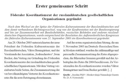Der Koordinationsrat hält es für unzulässig, dass die im Wesen private „Moskauer Deutsche Zeitung“ aus Haushaltmitteln Deutschlands und Russlands finanziert wird, wodurch der Kurs der Diskreditierung russlanddeutscher Organisationen, das Schüren von Konflikten zwischen diesen und die Unterstützung von Kräften, die sich gegen die Rehabilitierung [...] unseres Volkes stellen, unterstützt wird.