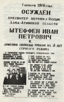 Mitteilung über den Gerichtsprozess gegen den Prediger Johann Steffen aus Issyk, Gebiet Alma-Ata, Kasachstan. Er wurde 1976 zu 5 Jahren Straflager "Verstöße gegen sowjetische Gesetze" verurteilt. Hauptanklagepunkt war, dass er in seiner Gemeinde die Religionsunterweisung von Kindern und Jugendlichen zuließ.